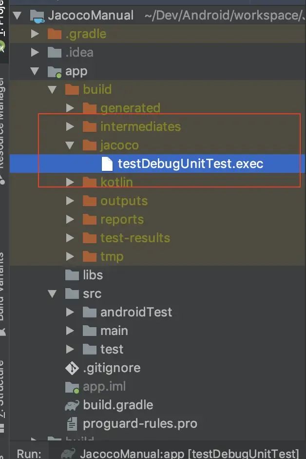 3、执行 testDebugUnitTest 后,会在app/build/jococo/ 下看到 testDebugUnitTest.exec。记住这个文件 我们会在后面用这个文件来生产报告。