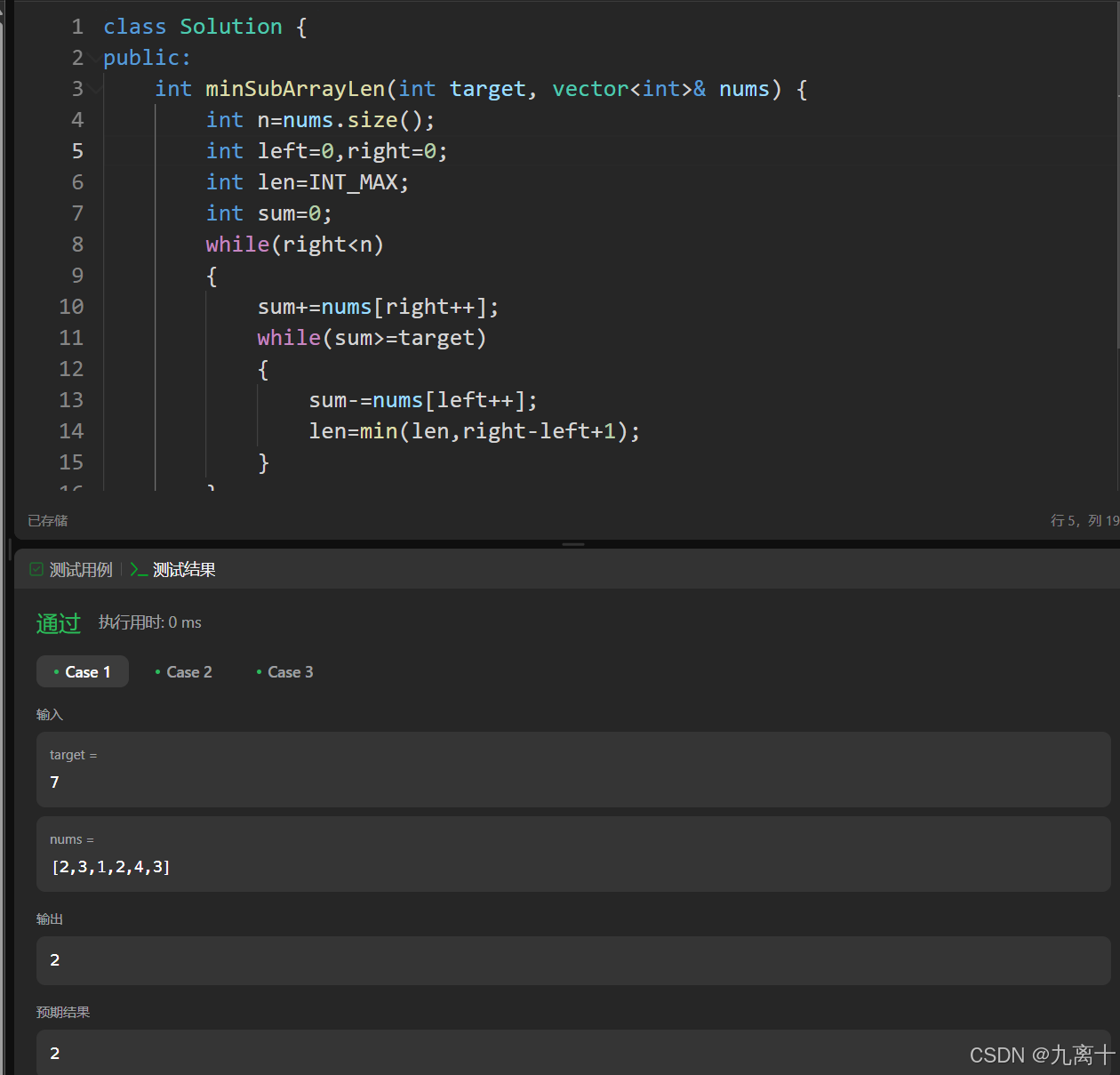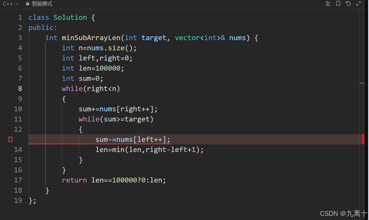 public:int minSubArrayLen(int target, vector<int>& nums) {int n=nums.size();int left,right=0;int len=INT_MAX;int sum=0;while(right<n){sum+=nums[right++];while(sum>=target){sum-=nums[left++];len=min(len,right-left+1);}}return len==INT_MAX?0:len;}