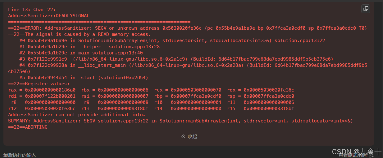 这可能就是导致错误的原因。比如,当第一次进入内部的while循环时,sum已经足够大,这时候left的值可能是一个很大的数,导致数组访问越界,或者在sum -= nums[left++]的时候出现负数索引或者超过数组长度的索引,从而引发运行时错误,比如段错误或者访问越界异常。
