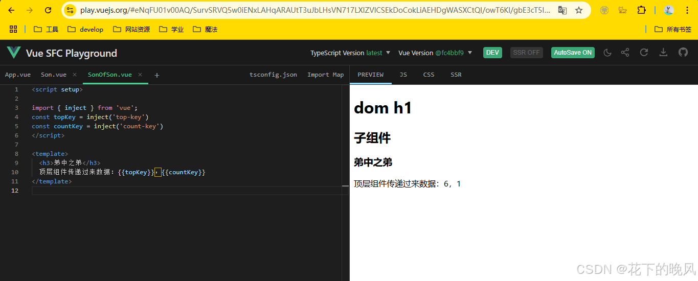 </script><template><h3>弟中之弟</h3>顶层组件传递过来数据:{{topKey}},{{countKey}}