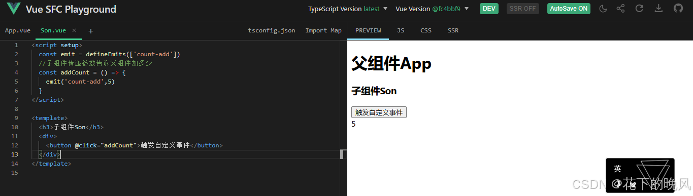 </script><template><h3>子组件Son</h3><div><button @click="addCount">触发自定义事件</button></div>