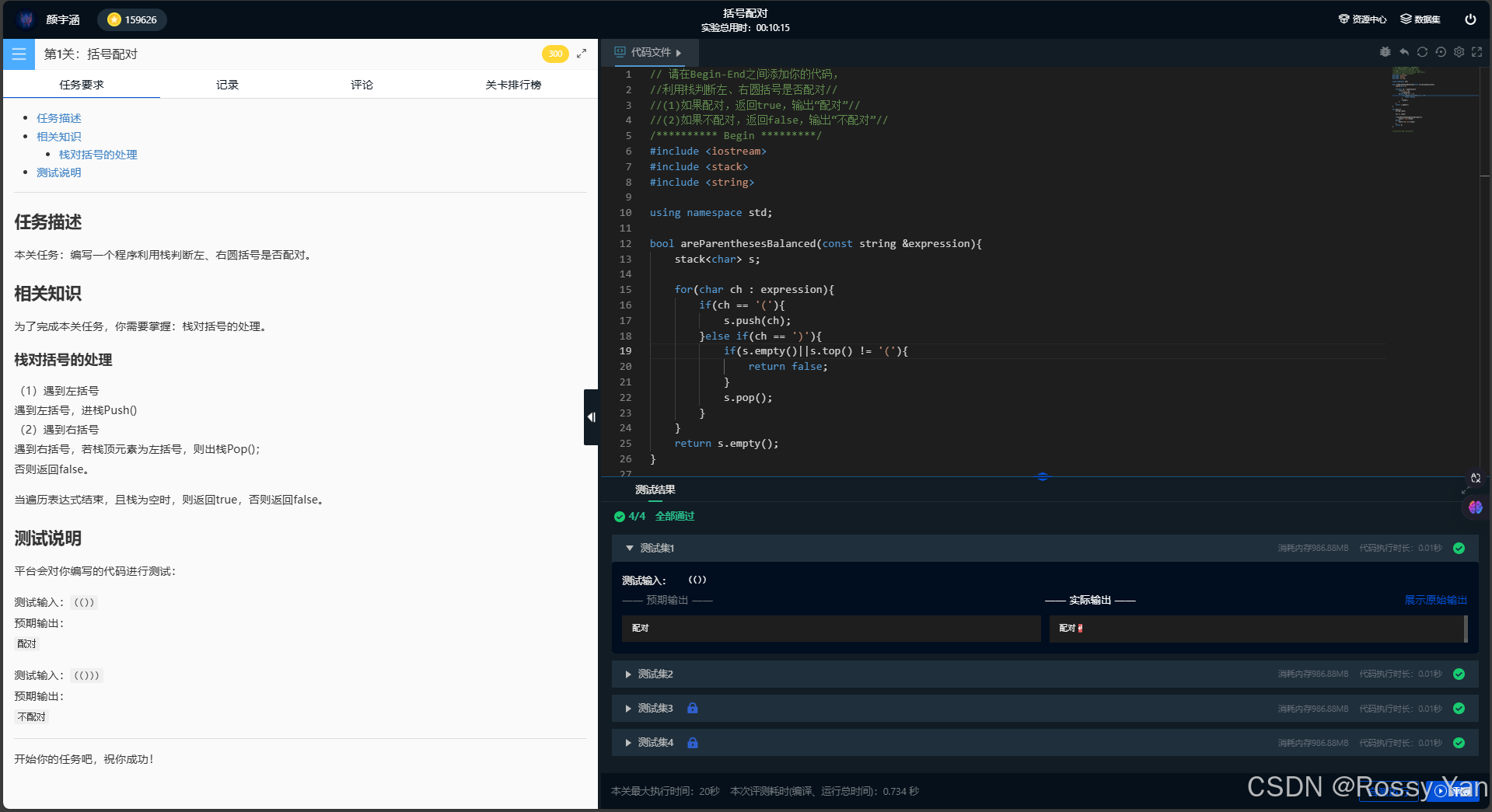 #include <iostream> #include <stack> #include <string>using namespace std;bool checkBrackets(const string& expression) {stack<char> st; // 创建一个用于存储括号的栈for (char ch : expression) { // 遍历表达式中的每一个字符if (ch == '(') { // 如果是左括号st.push(ch); // 将左括号压入栈} else if (ch == ')') { // 如果是右括号if (st.empty()) { // 先检查栈是否为空return false; // 若为空,说明没有匹配的左括号,直接返回false}st.pop(); // 如果栈不为空,弹出栈顶元素(匹配的左括号)}}return st.empty(); // 遍历完表达式后,若栈为空则括号匹配正确,返回true,否则返回false }int main() {string expression = "(3 + 4) * (2 - 1)";bool result = checkBrackets(expression);if (result) {cout << "括号匹配正确" << endl;} else {cout << "括号匹配错误" << endl;}return 0; }在上述代码中: