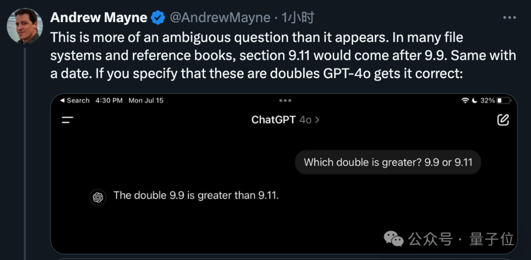 后来Goodside也补充,并不是说大模型无论如何都认定了这个错误结论。而是当以特定方式提问时,许多领先模型都会告诉你9.11>9.9,这很奇怪。