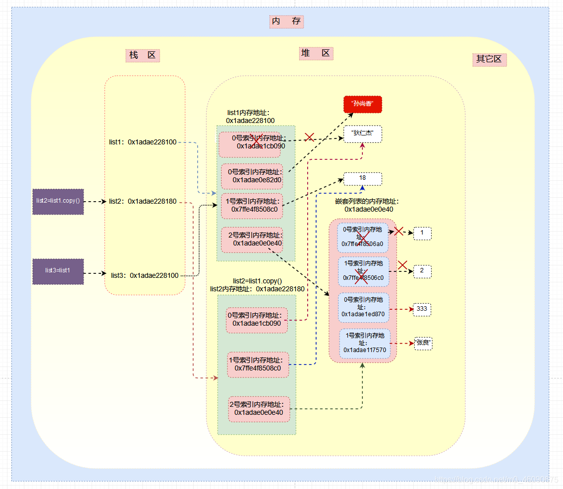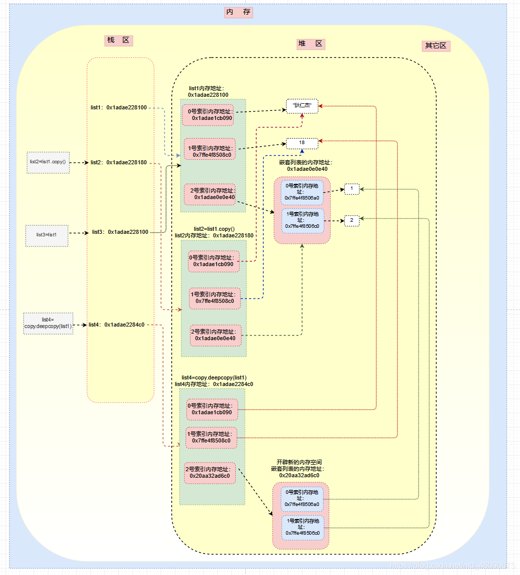 # 可见浅拷贝只拷贝第一层的内存地址,第一层的内存地址与旧列表指向相同的内存空间