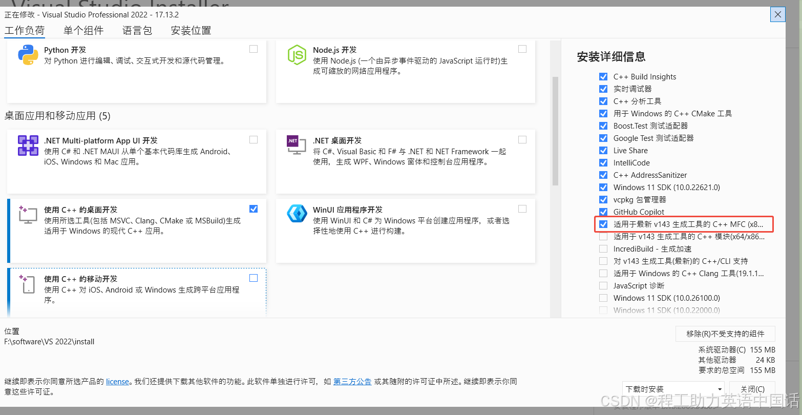 工具:visual studio 2022安装使用C++的桌面开发时报错:"无法打开 源 文件 "afxwin.h"".