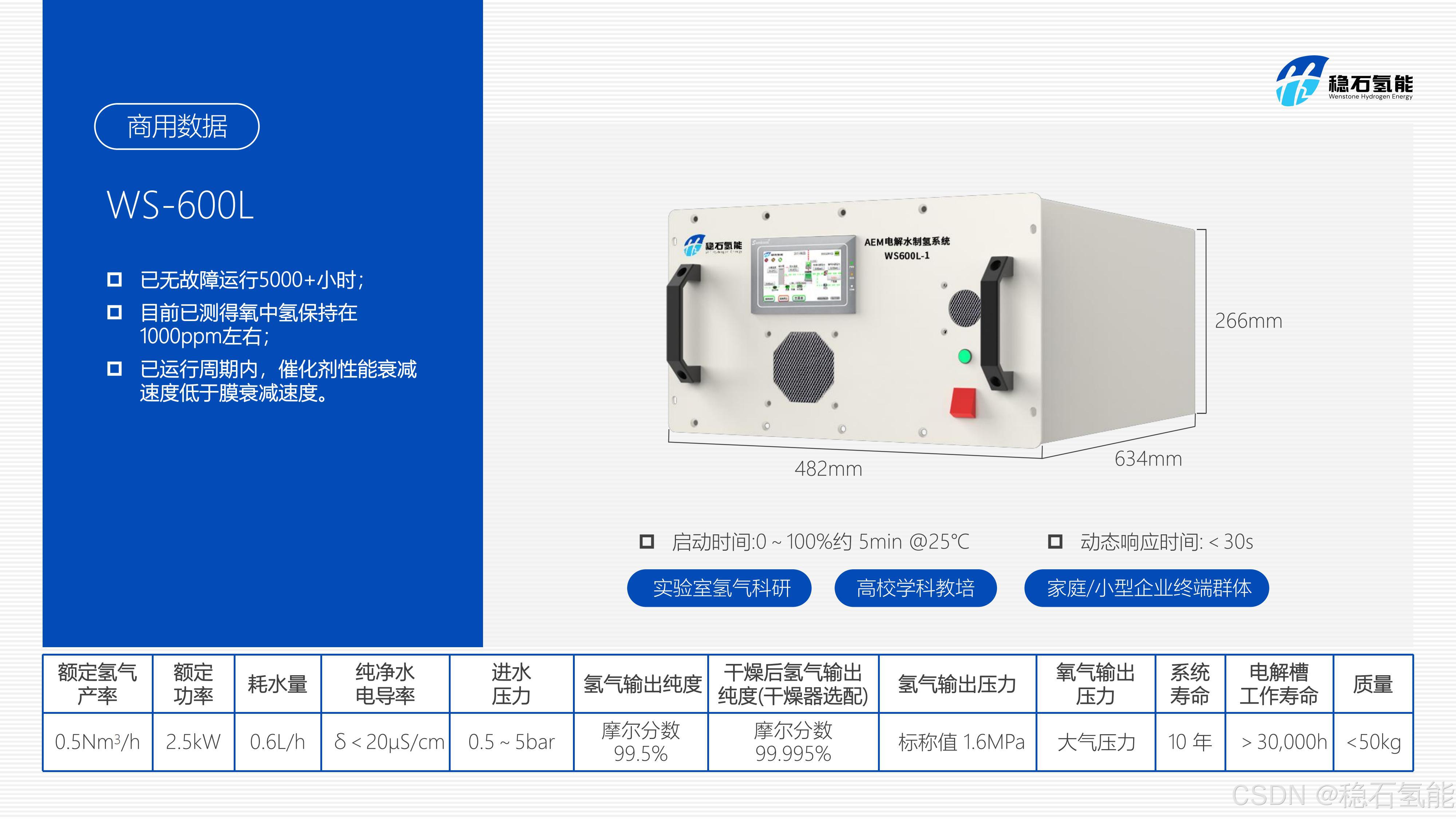 稳石氢能持续强化与迭代了膜、膜电极、催化剂与集控系统在内的四大核心技术,多环节优化进一步提升了稳石氢能AEM电解水制氢系统整体稳定性,目前小功率单槽产品商用实测已无故障累计运行5000+小时,运行周期内氧中氢保持在1000ppm左右,催化剂性能衰减速度低于膜衰减速度,产品性能得到了用户的认可。