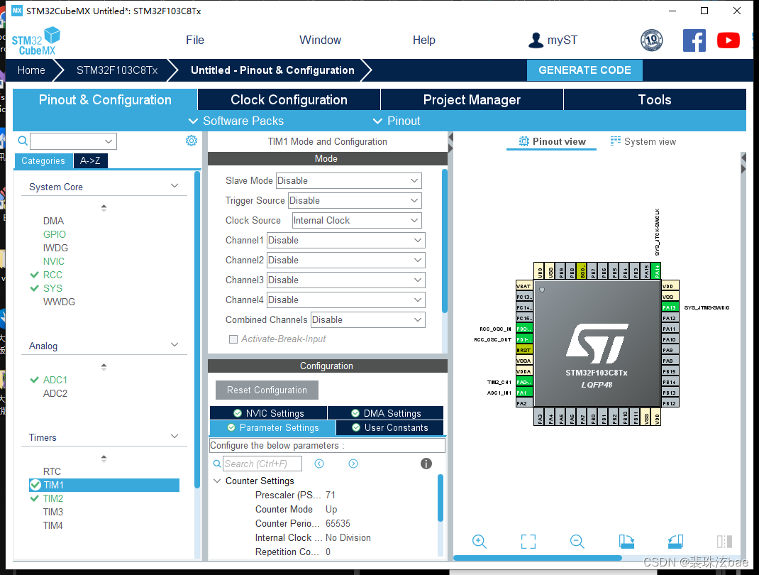 TIM1配置:由上面可知HC-SR04的使用需要us级的延迟函数,HAL库自带只有ms的,所以需要自己设计一个定时器