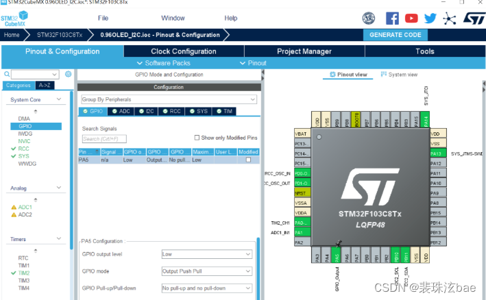 GPIO配置:PA5接到了HC-SR04的TRIG触发引脚,默认输出低电平